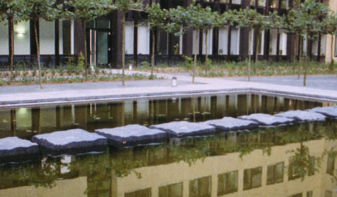 Im Wasserbecken (Innenhof der LVA), sind 11 Trittsteine im Verlauf der Mittelachse angeordnet. Durch die Gestaltung entsteht eine Korres-pondenz zwischen dem fließenden Element Wasser und den Oberflächen der Steine.